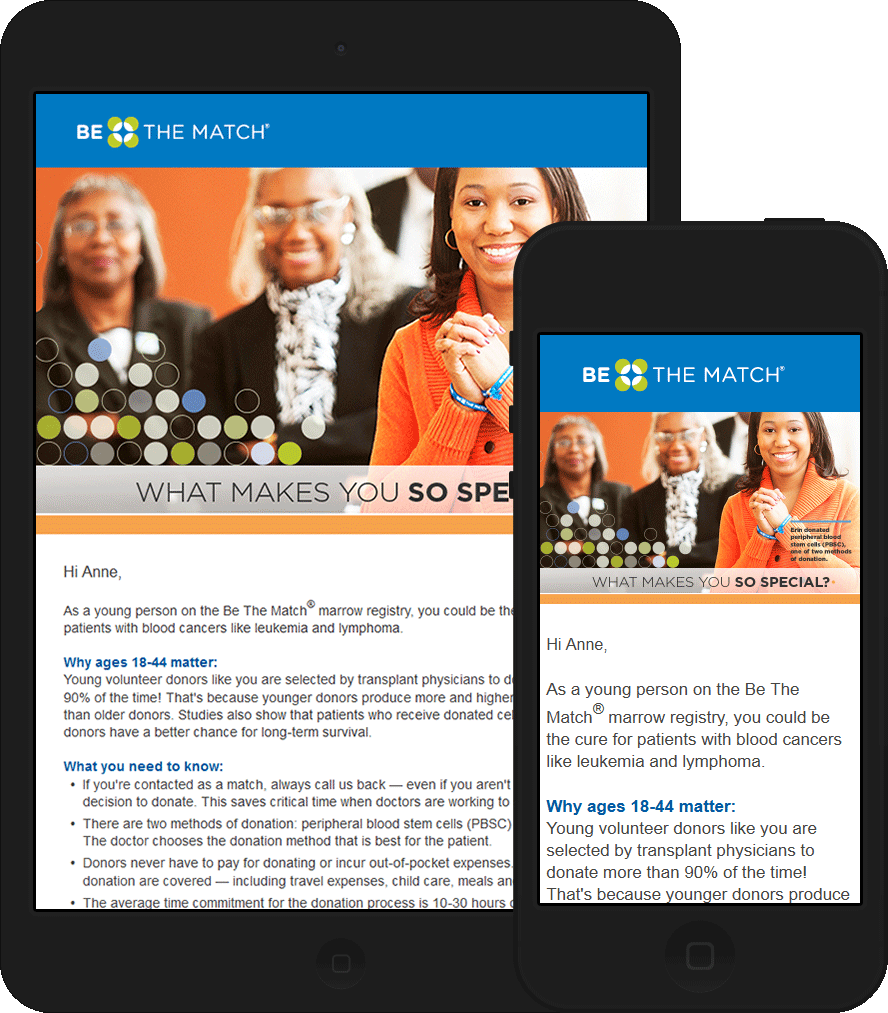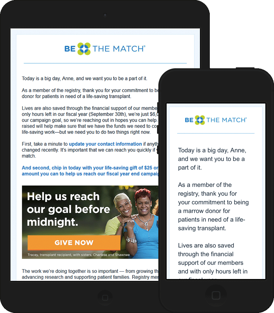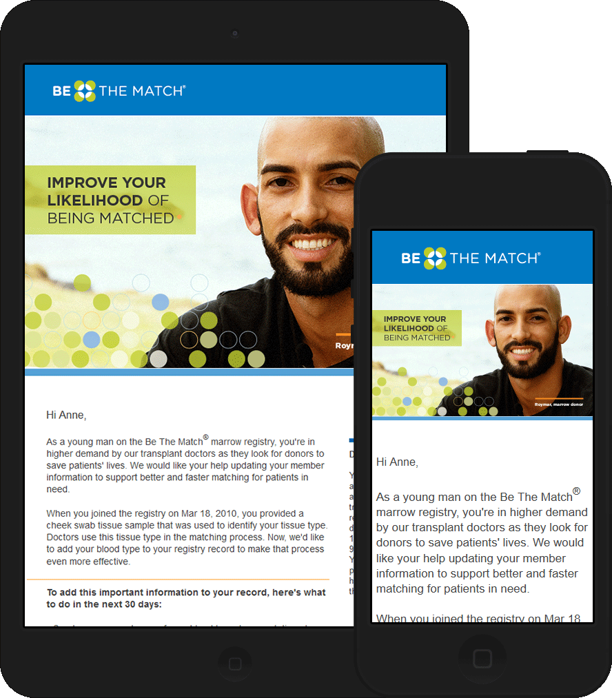 This email uses images for buttons due to client specifications. The footer links are not fully optimized for mobile due to the vertical separators between them. However, this issue was resolved in the series (tissue donation recruitment series above) sent after this email.