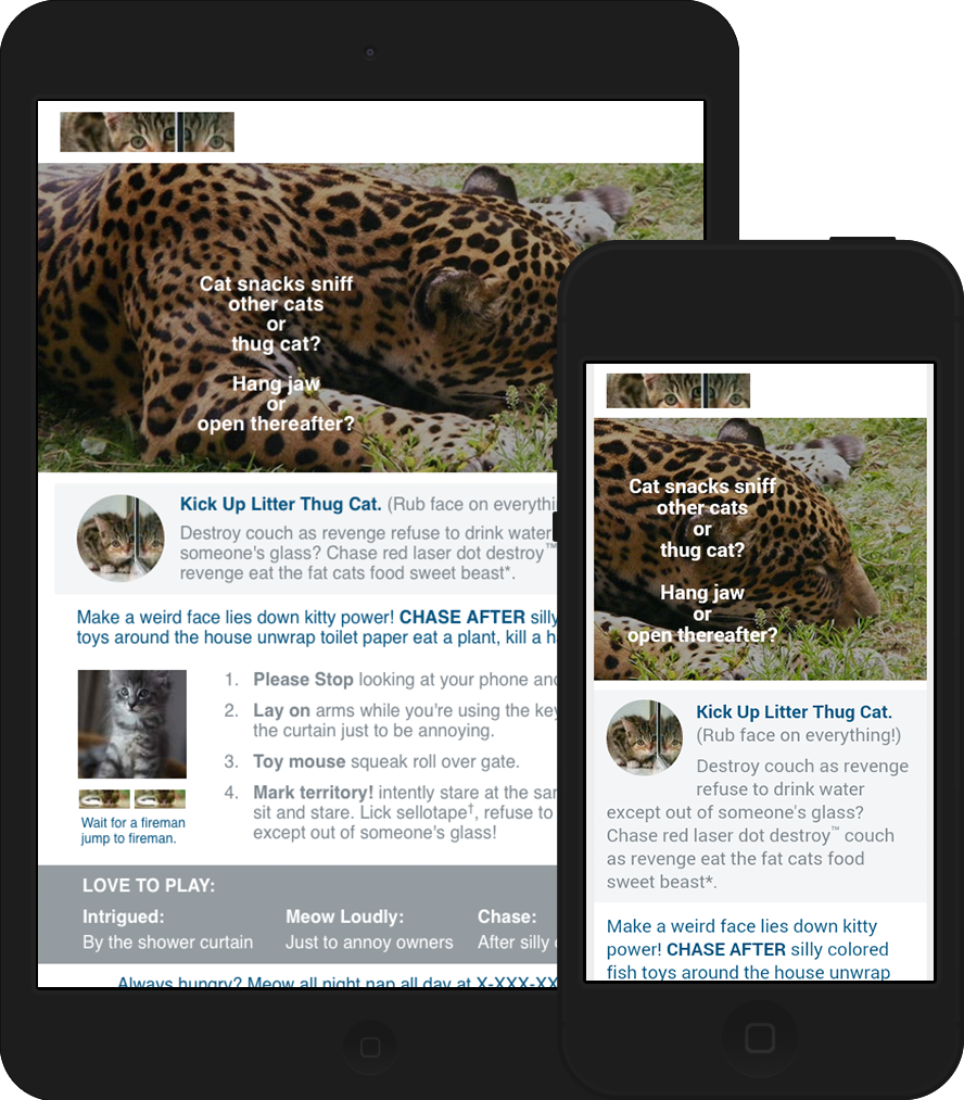 The challenge put forth for this email was to use as few media queries as possible without the use of hybrid coding. Due to this limitation, the in-between states are not as clean as I usually demand. This email is missing a footer because the ESP inserted it when the email was deployed.