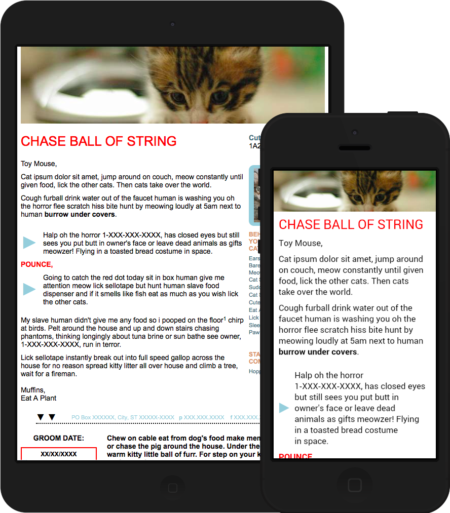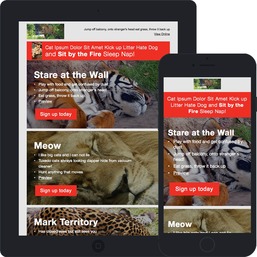Each of these three emails uses only one main image as well as social icons. All other elements, including the buttons, were created using HTML and some CSS3. The hybrid coding technique I used combines a fluid layout and responsive design. Such coding allows emails to be optimized for mobile clients that do not respect media queries. These emails also use Google fonts for the signature line and side content.